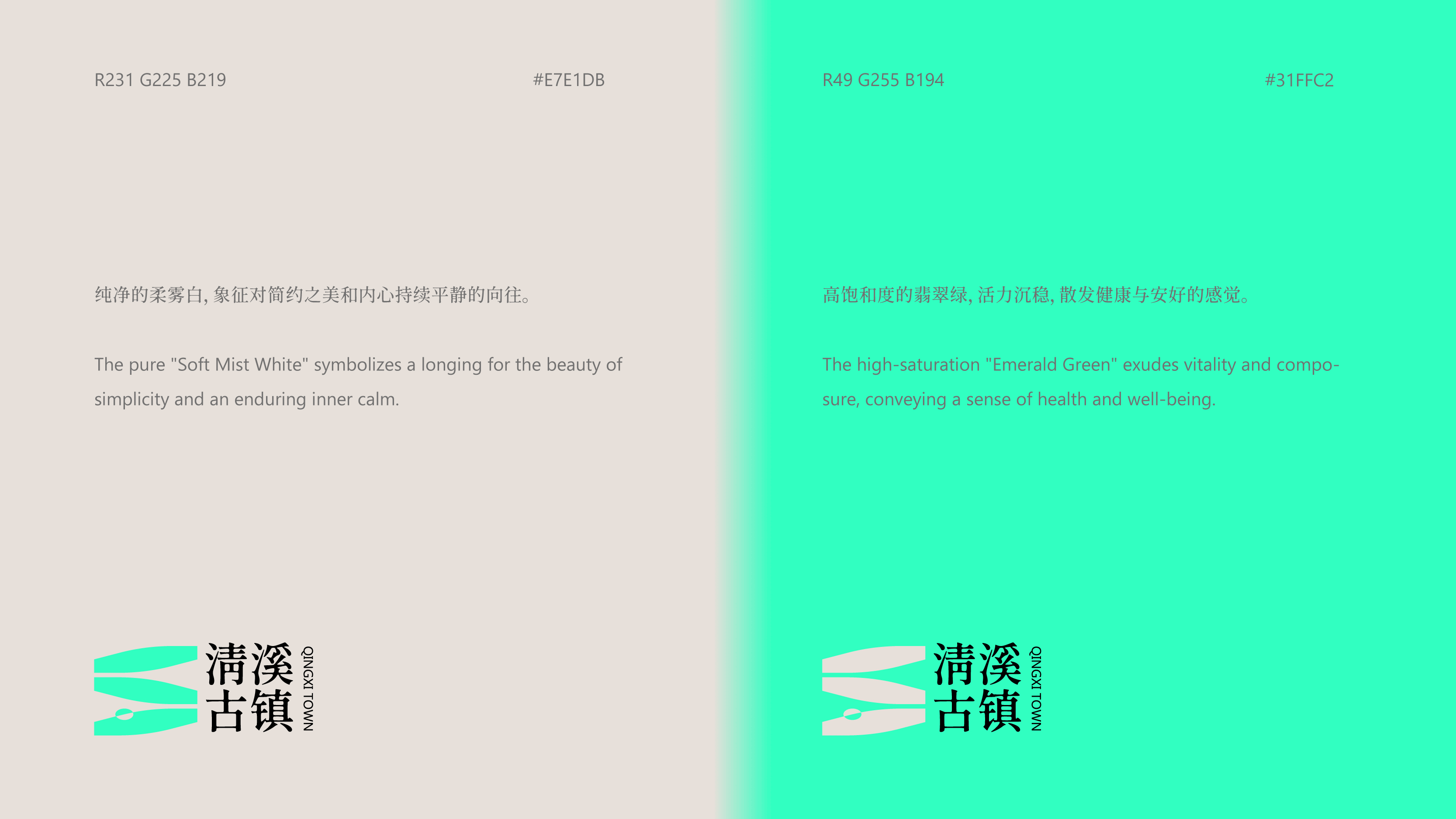 这些清溪的代表性元素以抽象形式分层体现于标志设计中。标志以渐变色 为主,赋予其立体感与柔美气质。主题色搭配沉稳柔雾白与充满活力的高饱 和翡翠绿,既体现了清溪的内敛之美,又传递出其勃勃生机与活力,完美契 合古镇的气质与精神内核。