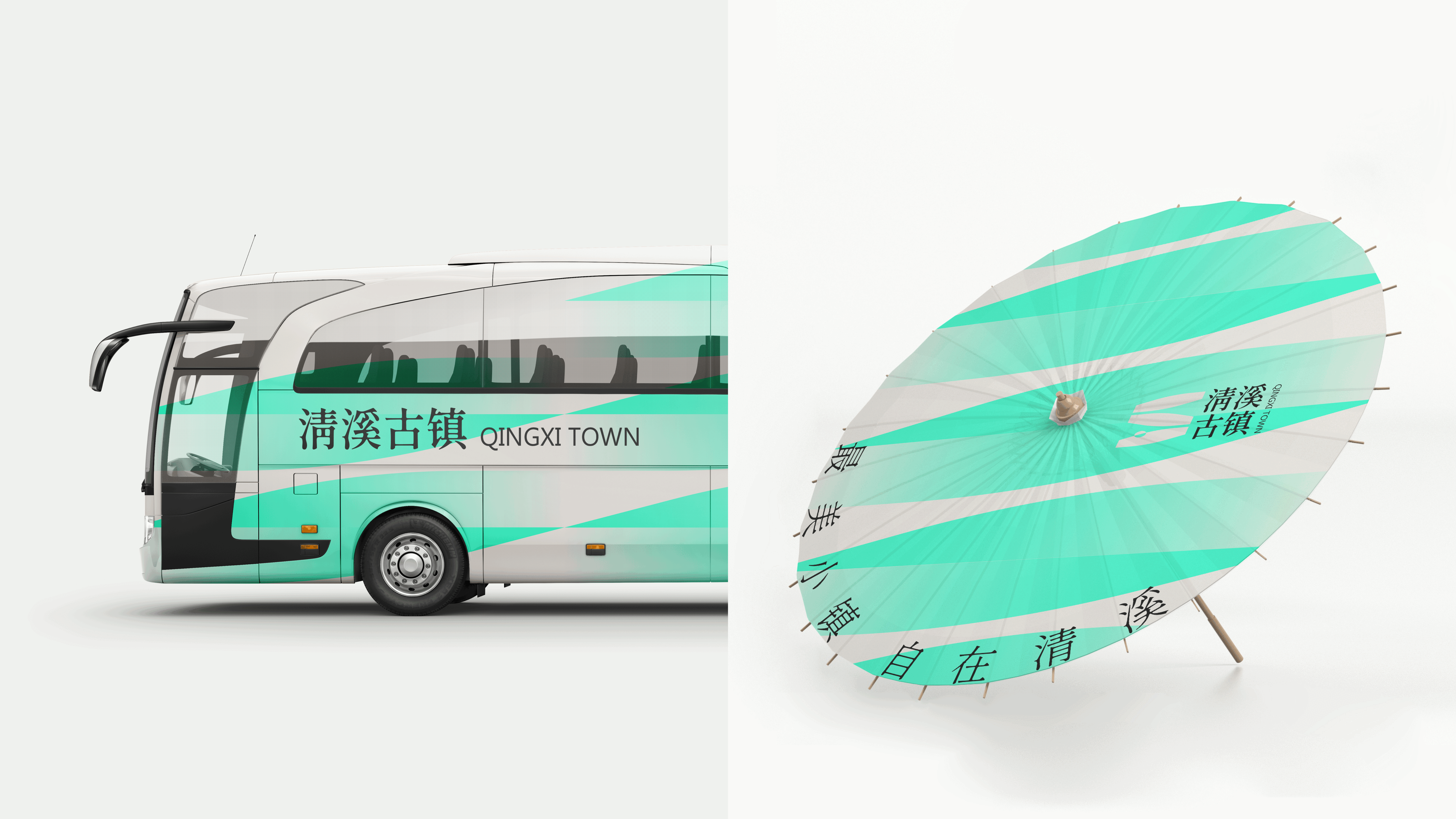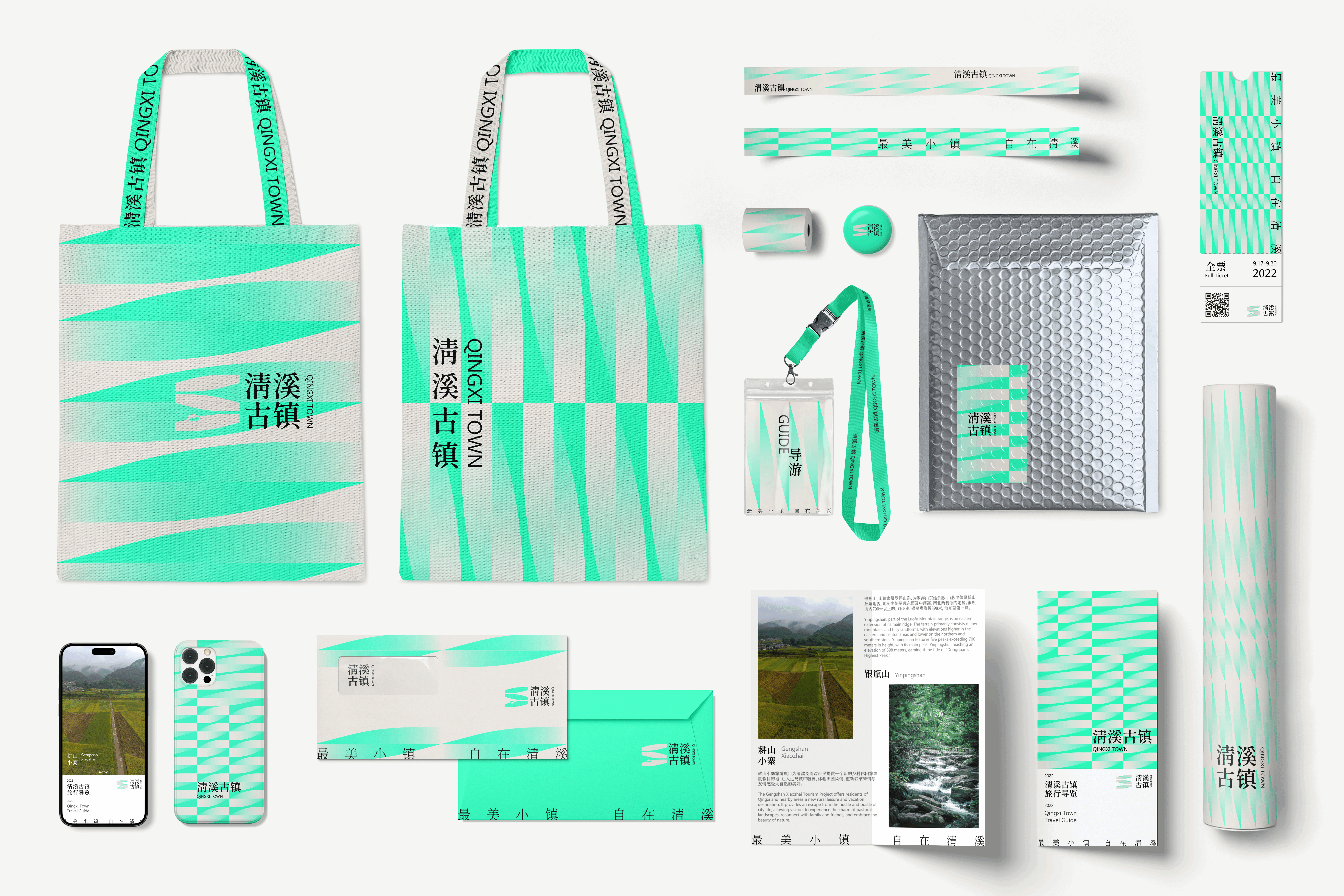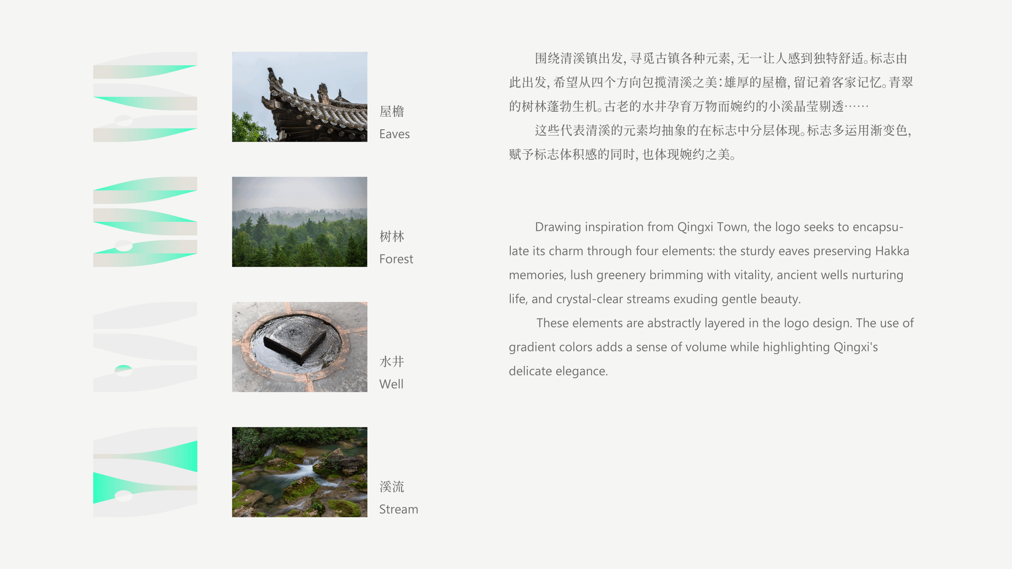 These iconic elements of Qingxi are abstractly layered in the logo de sign. The logo primarily employs gradient colors, giving it a sense of depth and a soft aesthetic. The theme colors are a combination of a steady misty white and a vibrant high-saturation emerald green, reflecting both Qingxi's beauty and its dynamic vitality, perfectly aligning with the spirit and character of the ancient town.