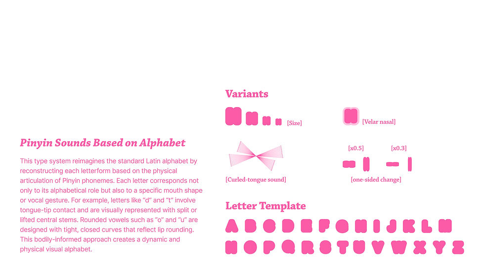 This project uses experimental type design to visualize this interference. Drawing on mouth shapes in Pinyin articulation, the typeface turns oral movement into visual form, expressing the tension and emotion of language learning. It also reflects how Pinyin continues to shape the pronunciation of loanwords, revealing its lasting impact on cross-linguistic experience.